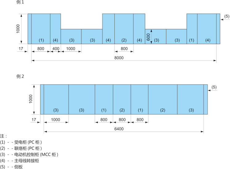 ◎ 當PC與MCC二種裝置相鄰排列時,則:1.當MCC雙面柜(或600深度的MCC單面柜)與PC柜相鄰排列時,在二柜之間必須加轉接柜(其寬度為400mm)如圖6例1所示。2.將單面操作的MCC加深到1000mm時,則可以不加轉接柜,如圖6例2所示。